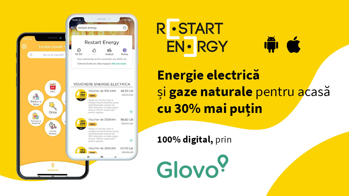 Restart Energy este primul și singurul furnizor român care permite acum consumatorilor din România să achiziționeze energie verde sau gaze naturale prin intermediul aplicației mobile Glovo, sub formă de vouchere valorice, cu 30% mai ieftine.